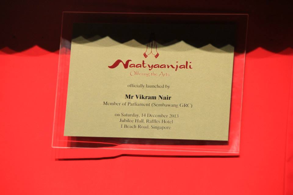 After 7 years of conducting Bharathanatyam classes and performances, Naatyaanjali (Offering the Arts) was officially launched by Mr. Vikram Nair (Member of Parliament, Sembawang GRC) on 14 December 2013. On the same day, Naatyaanjali conducted its first Bharathanatya Arangetram in Jubilee Hall, Raffles Hotel.